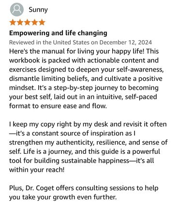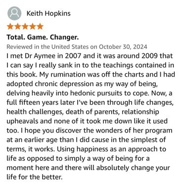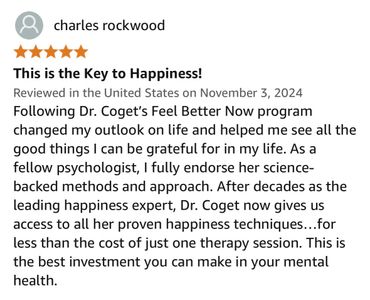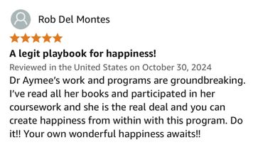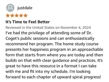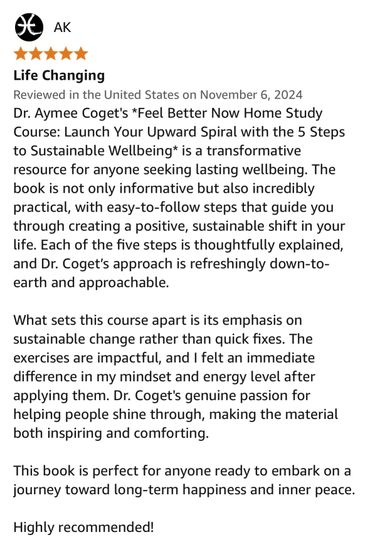 The Feel Better Now Home Study Course is your go-to guide for rewiring your brain and reclaiming your joy. Written by happiness expert Aymee Coget, PhD, creator of the Make Me Happy The Happiness Makeover®, author of Happiness for HumanKind Playbook: Sustainable Happiness in 5 Steps and Find Your Blissful Calling, The Feel Better Now Home Study Course takes Dr. Aymee's innovative tools and techniques and guides you in apply them so you can flourish at your own pace in the comfort of your home.